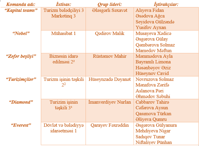 Bu kimi intellektual tədbirlərin keçirilməsi fakültəmizdə tədris prosesinin keyfiyyətinin yüksəldilməsinə və tələbələrin hərtərəfli inkişafına xidmət edir. İştirak edən komandalardan “Kapital teams” komandası I yer, “Nobel” komandası II yer, “Zəfər beşliyi” III yer, “Turizmçilər” komandası IV yer, “Diamond” komandası V yer, “Everest” komandası VI yer tutmuşlar.