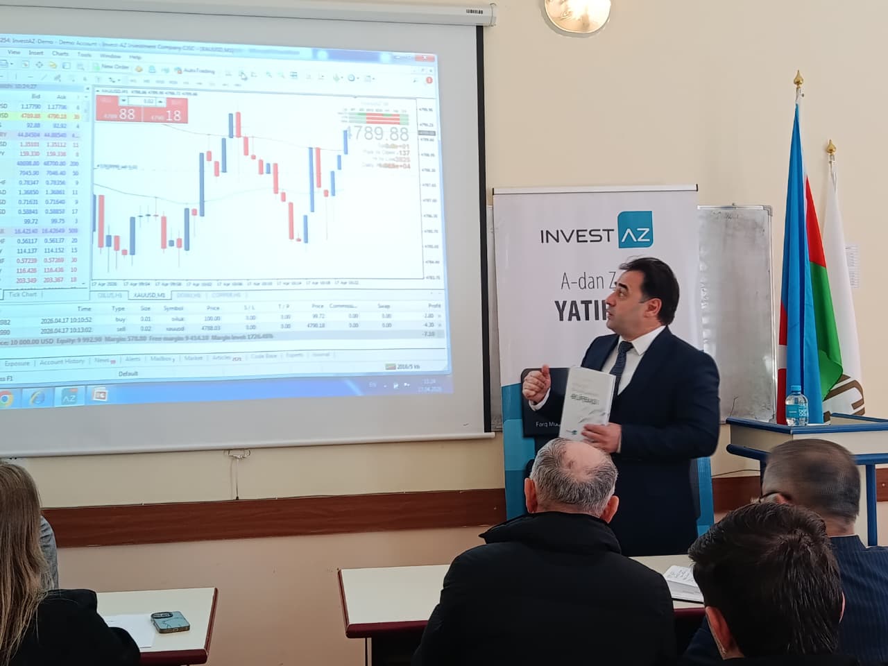 Master Klass çərçivəsində ilk olaraq “InvestAZ İnvestisiya Şirkəti” QSC-nin Tədris və Analitika departamentinin baş mütəxəssisi, PhD Rövşən Məmmədov çıxış edib. O, “Birjada qiymətin düşməsindən necə qazanmaq olar?” mövzusuna toxunaraq, maliyyə bazarlarının təkcə artım deyil, həm də eniş trendlərində təqdim etdiyi imkanları izah edib. R.Məmmədov risklərin idarə olunması, müasir investisiya strategiyaları və birja əməliyyatlarının texniki-fundamental əsasları barədə ətraflı məlumat verərək, real bazar nümunələri ilə fikirlərini əsaslandırıb.