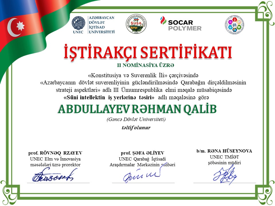 “İqtisadiyyat və idarəetmə” fakültəsinin “İqtisadiyyat” ixtisasının II kurs tələbəsi Abdullayev Rəhman Qalib oğlu Azərbaycan Dövlət İqtisad Universitetinin təşkilatçılığı ilə “Konstitusiya və Suverenlik ili” çərçivəsində “Azərbaycanın dövlət suverenliyinin gücləndirilməsində Qarabağın dirçəldilməsinin strateji aspektləri” adlı III Ümumrespublika elmi məqalə müsabiqəsində “Süni intellektin iş yerlərinə təsiri” adlı məqaləsinə görə sertifikatla təltif olunmuşdur. Bundan əlavə, Rəhman akademik inkişaf və elmi yaradıcılıq yolunda inamla irəliləyərək, bir çox beynəlxalq sertifikatlar əldə etmişdir. Bu uğur gənc tədqiqatçıların elmi potensialının inkişafının bariz nümunəsidir. Tələbəmizi əldə etdiyi nailiyyətlərə görə təbrik edirik və gələcək elmi fəaliyyətində uğurlar arzu edirik.