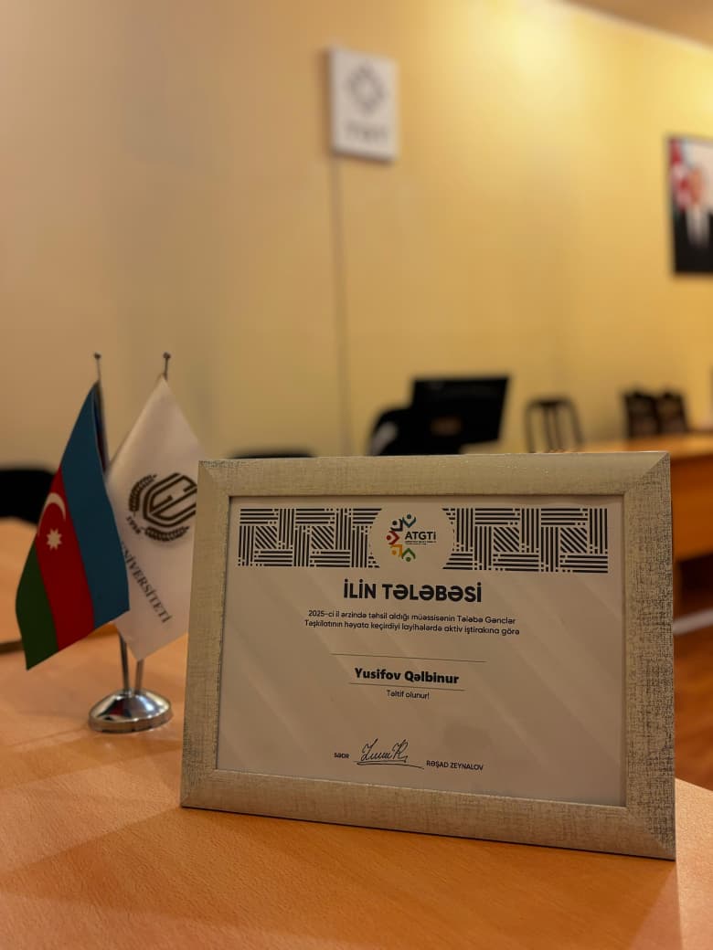 Gəncə Dövlət Universitetinin “İqtisadiyyat və İdarəetmə” fakültəsinin tələbəsi, AHİK fakültə sədri Qəlbinur Yusifov 2025-ci il ərzində təhsil aldığı müəssisənin TGT-nin həyata keçirdiyi layihələrdə aktiv iştirakına görə fərqlənmişdir. Tələbəmiz, Tələbə Gənclər Təşkilatının (TGT) həyata keçirdiyi müxtəlif yerli və regional layihələrdə, sosial təşəbbüslərdə və intellektual yarışlarda nümayiş etdirdiyi aktiv iştirakına görə “İlin tələbəsi” fəxri adına layiq görülmüşdür.