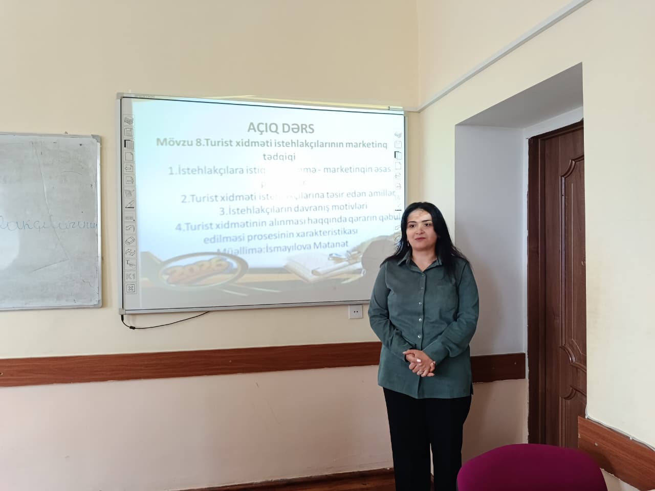 “Menecment və turizm işi” kafedrasının müəllimi Mətanət İsmayılova “Turizm marketinqi” fənnindən “Turist xidməti istehlakçılarının marketinq tədqiqi” mövzusunda “Turizm bələdçiliyi” ixtisasının (I kurs) tələbələrinə açıq dərsi təşkil etmişdir. Dərsdə fakültə dekanı dosent Məsim Abadov, kafedranın müdiri dosent Əli Allahverdiyev, müəllim Gülnarə Bağırova, müəllim Gülşən Tağıyeva iştirak etmişlər.